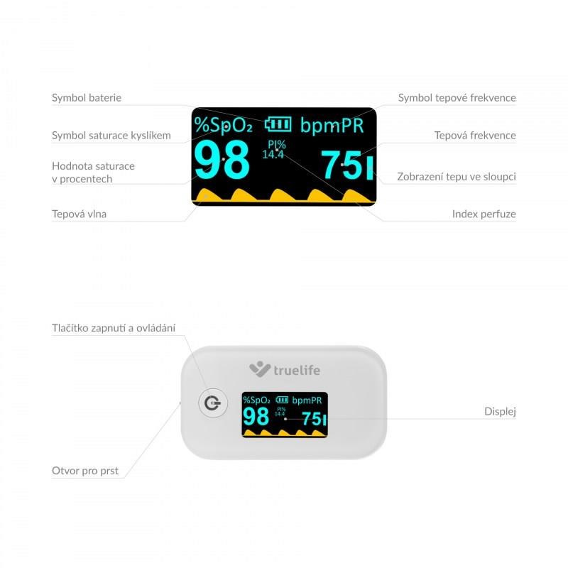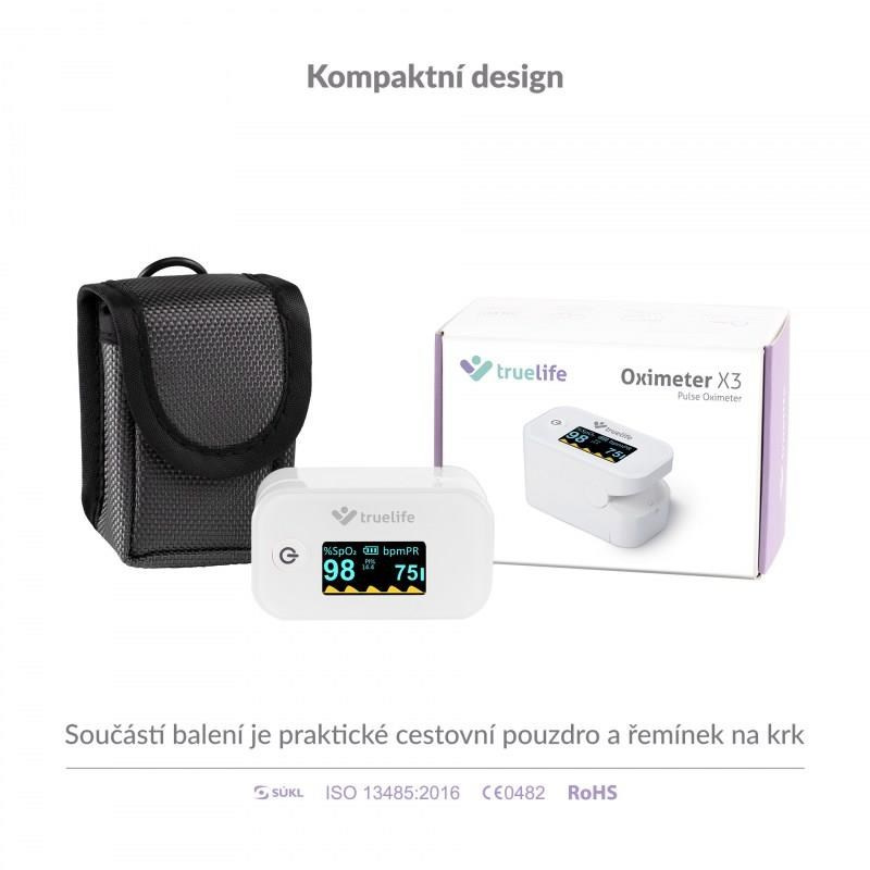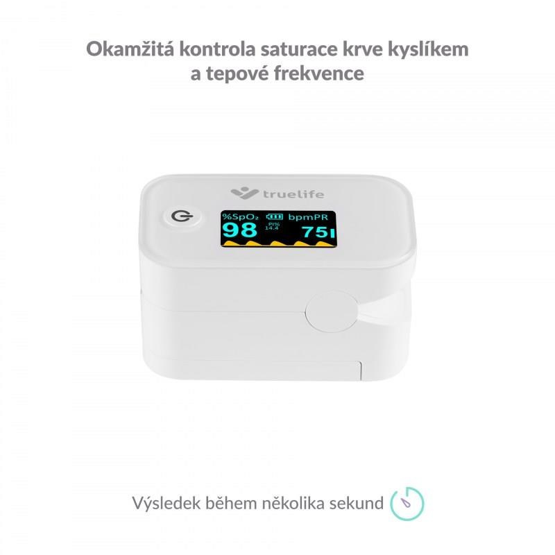 Oxymetr TrueLife X3 zajistí okamžité a přesné měření saturace krevního hemoglobinu kyslíkem a tepové frekvence. Naměřené hodnoty okamžitě a přehledně zobrazí na vestavěném displeji. Je vhodný zejména pro pacienty s respiračním onemocněním nebo onemocněním srdce, ale i pro vrcholové sportovce. Své uplatnění ale nalezne v lékárničce každé domácnosti.
