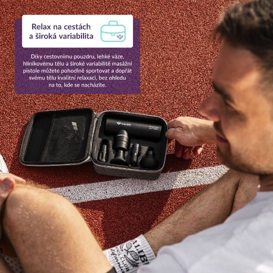 Masážní pistole s vámi může cestovat kamkoliv, stačí ji zabalit do přiloženého cestovního pouzdra.