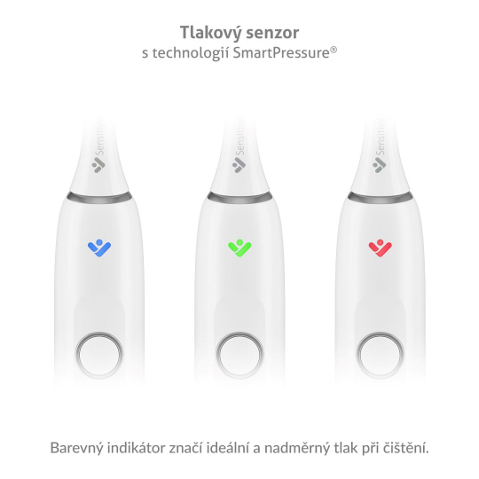 Technologie SmartPressure® sleduje tlak, jakým na zuby a dásně působíte, a barevně vás navede k ideálnímu čištění. Modrá značí optimální tlak, zelená maximum, a při červeném světle vás kartáček přerušenými vibracemi upozorní, že je čas zvolnit. Díky tomu, že je indikátor viditelný jak zepředu, tak i zezadu kartáčku, máte v zrcadle vždy jasnou kontrolu nad svojí technikou čištění a tím i nad zdravím celé ústní dutiny. Sonická technologie SonicTrue® pak pomocí jemných vibrací a mikrobublinek čistí i hůře přístupná místa, a přitom zůstává šetrná k zubní sklovině i citlivým dásním.