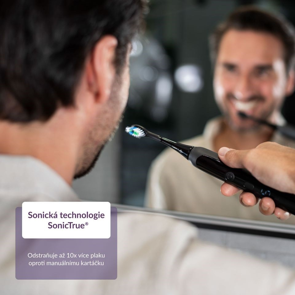 Sonická technologie SonicTrue® funguje na bázi jemných vibrací, při kterých štětiny kartáčku kmitají vysokou rychlostí a efektivně odstraňují zubní plak. 80 000 pohybů za minutu vhání vodu se zubní pastou i do mezizubních prostor a jemné vibrace nedají šanci plaku, skvrnám ani bakteriím. Sonická technologie je navíc šetrnější k zubní sklovině, než manuální čištění nebo rotační kartáčky.