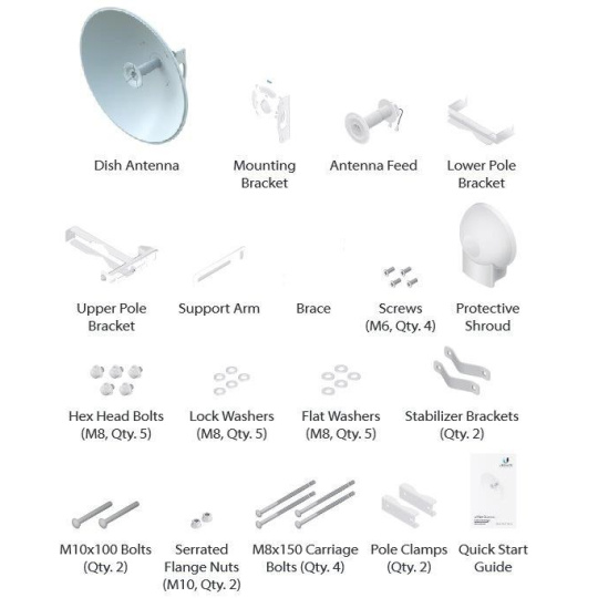 Speciální 5GHz směrová anténa určená pro airFiber-5X se ziskem 30dBi, průměr antény je 650mm. Úzká vyzařovací charakteristika (5°) a polarizace posunutá o 45° proti standartní H/V polarizaci garantuje nejvyšší možný poměr signálu a šumu (SNR) a vysokou odolnost vůči interferencím s jinými spoji.