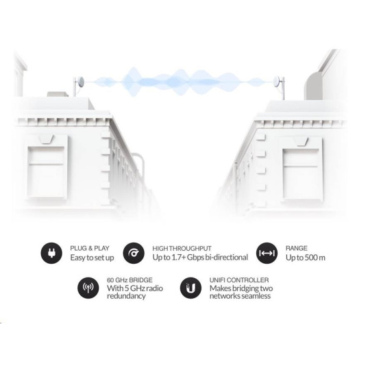 UniFi Building Bridge je 60GHz point-to-point pojítko s 5GHz zálohou pro rozšíření sítě například o sousední budovu. Propustnost pojítka je 1.7Gbps+ s maximálním dosahem 500m a správou nebo monitoringem přes UniFi Controller.