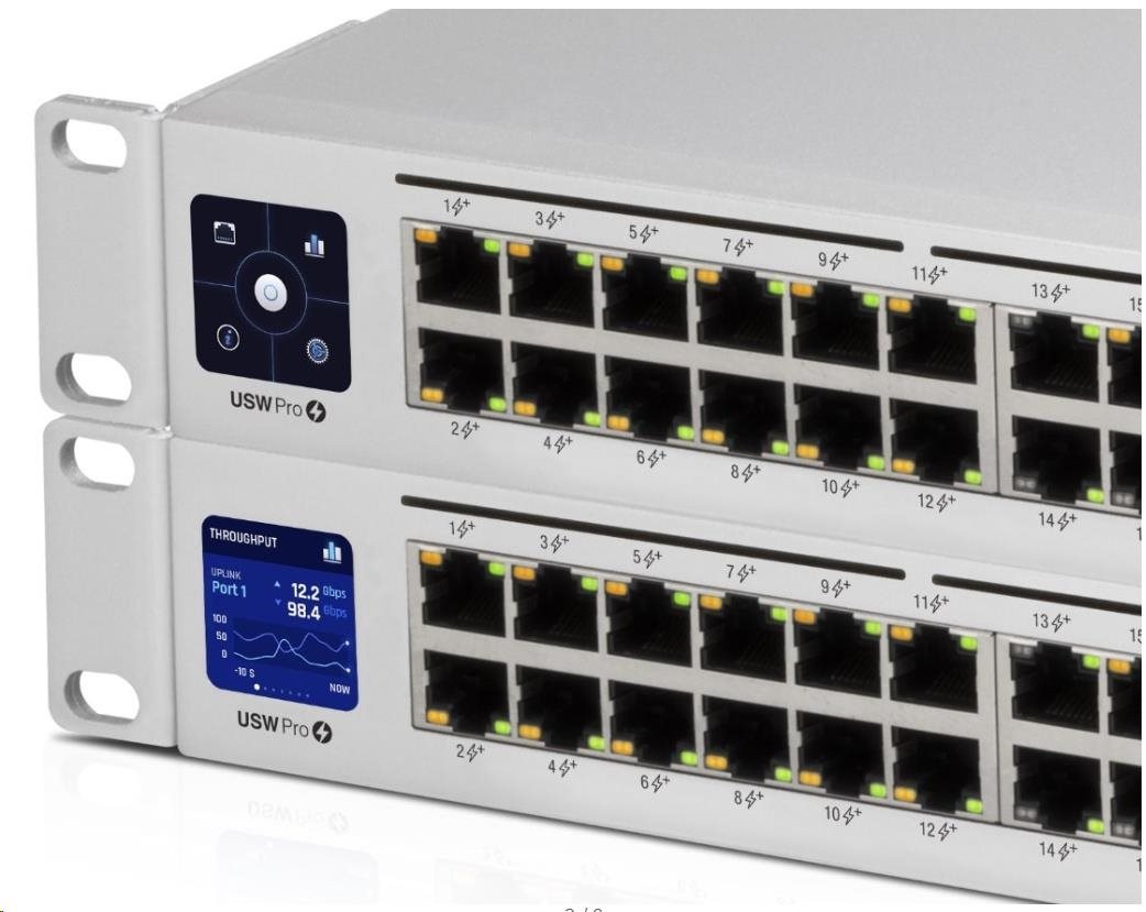 Jako Uplink poslouží dvojice portů 10G SFP+ se zpětnou kompatibilitou 1G SFP. Pro případ výpadku napájení nebo poruchy interního zdroje je možné switch připojit k záložnímu systému UniFi SmartPower, který obslouží až 6 podporovaných zařízení.