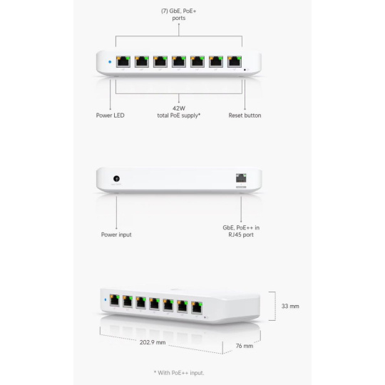Popis produktu Kompaktní 8 portový gigabitový PoE switch. Switch disponuje 1 PoE in portem a 7 PoE out porty s podporou PoE napájení 802.3af/at s maximálním zatížením až 30W na port. Switch je spravován pomocí aplikace UniFi network umožňující centrální správu Vaší sítě včetně cloudového přístupu. Maximální PoE budget switche je závislý na způsobu napájení: • při napájení DC adaptérem 54V/3,9A (součástí balení) je PoE budget 52W • při napájení pasivním PoE adaptérem nebo 60W PoE++ adaptérem je PoE budget 45W Obsah balení • switch • napájecí adaptér 54V/3,9A • montážní set • Technické parametry • Konektory a rozhraní • Rychlost LAN:(8) 10/100/1000Mbps • Napájení • Typ napájení:DC konektor, PoE • Typy PoE:PoE-Out + PoE-In • Podporované PoE-Out standardy:802.3af, 802.3at • Počet PoE Out portů:7 • PoE budget [W]:52 • Max. spotřeba energie [W]:60 • Napájení přes konektor/svorkovnici:44 .. 57V DC • Fyzické charakteristiky • Provedení:Na zeď, Desktop • Ventilátory:Bez ventilátoru • Šasi:Plastové • Tlačítka:Reset • Provozní teplota [°C]:-15 až 45 • Šířka [mm]:203 • Výška [mm]:33 • Hloubka [mm]:76 • Obecné • Rychlost přepínání [Gbps]:8 • Software • Management:UniFi controller • Funkce:VLAN.