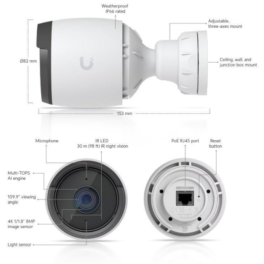 Popis produktu UniFi G6 Bullet kamera disponuje 8MP snímačem s rozlišením 3840 x 2160 při 30fps a objektivem s pozorovacím úhlem 109.9°, který je vybaven IR přísvitem pro noční vidění do vzdálenosti 30m. Dále je kamera vybavena mikrofonem pro záznam zvuku, 10/100 Mbps LAN portem s podporou PoE a stupněm krytí IP66 pro použití ve venkovním prostředí. Díky držáku jste schopni obraz směrovat ve všech 3 osách. Kameru je možné napájet pouze prostřednictvím PoE adaptéru nebo switche podporující standard 802.3af a pasivní PoE (36-57V DC). Maximální spotřeba kamery je 9,9W! AI funkce Díky implementaci AI kamera podporuje pokročilé detekce jako jsou detekce obličeje, detekce SPZ nebo chytré rozpoznání objektů (osoba, vozidlo, zvíře). Důležité vlastnosti • 8MP, 30 FPS video • AI chytré detekce • Noční režim s IR LED diodami • IP66 kryt odolný proti povětrnostním vlivům • Vestavěný mikrofon • Spravováno softwarem UniFi Protect • Odolnost vůči vandalům - IK04 Obsah balení • Zařízení • Šroubky + hmoždinky • Držák pro přichycení ke zdi • Kovová spona Technické parametry Kamera Typ objektivu:Fixní Přísvit:IR Dosah přísvitu [m]:30 Pozorovací úhel [°]:110 Režim den/noc:IR cut filtr Obrazový senzor ["]:1/1.8 Obraz Rozlišení:8MP Max. rozlišení [pixely]:3840 x 2160 (4K UHD) Konektory a rozhraní Audio:Mikrofon Rychlost LAN:(1) 10/100Mbps Napájení Napájení přes PoE:802.3af, 37 .. 57V DC Typ napájení:PoE Max. spotřeba energie [W]:9,9 Fyzické charakteristiky Stupeň krytí:IP66 Použití:Venkovní Antivandal (ochrana proti nárazu):IK4 Tlačítka:Reset Provozní teplota [°C]:-20 až 50 Hmotnost [g]:737 Šířka [mm]:82 Výška [mm]:82 Hloubka [mm]:153 Barva:Bílá Obecné Kamerová řada:UniFi Protect.