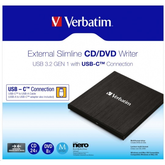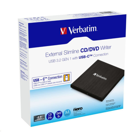 VERBATIM externí mechanika DVD-RW Rewriter USB-C, černá + NERO