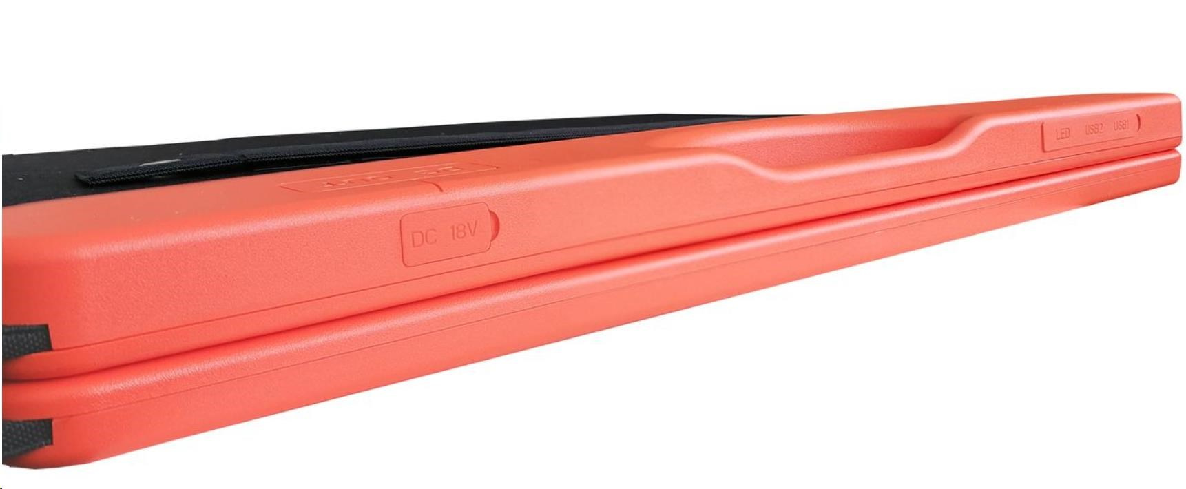 Modul je skládací, lehký a prostorově úsporný, a proto je vhodný pro mnoho použití. Panel lze pomocí integrovaných podpěr postavit pod úhlem 45°, aby byl zajištěn nejlepší možný výkon solárního panelu.Solární panel VIKING WB120, dokáže nabíjet vaše zařízení až do napětí 19,8V a 6,06A!