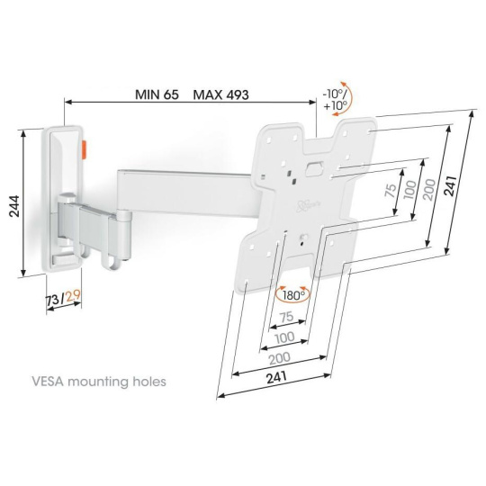 TVM 3243 je stylový nástěnný TV držák řady COMFORT Full-Motion+ a volíte s ním bezpečnost, design a optimální pohodlí při sledování. Držák je velmi robustní a vydrží intenzivní používání. Protože se může otáčet až o 180°, můžete si sledování TV vychutnat z jakéhokoli úhlu v místnosti. Naklápění je možné až do úhlu 20° (10° nahoru a dolů). TVM 3243 je vhodný pro televizory s úhlopříčkou od 19 do 43 palců a hmotností do 15 kg.