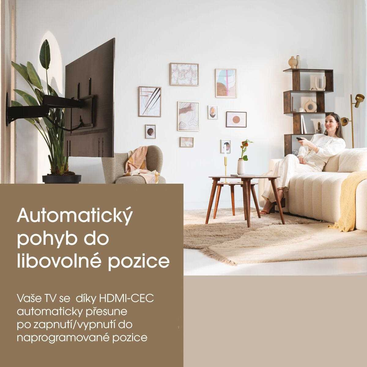 - Automatický pohyb při zapnutí TV, ovládání pomocí hlasových zkratek Siri, aplikace nebo dálkového ovládání.