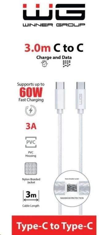 WG - Datový kabel Type-C na Type-C, 3 metry, 3A, 60W, bílá