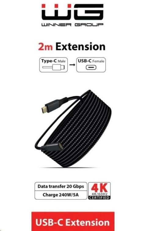 WG - Prodlužovací kabel USB-C (male) na USB-C (female), 2 metry, nylonový oplet, černá