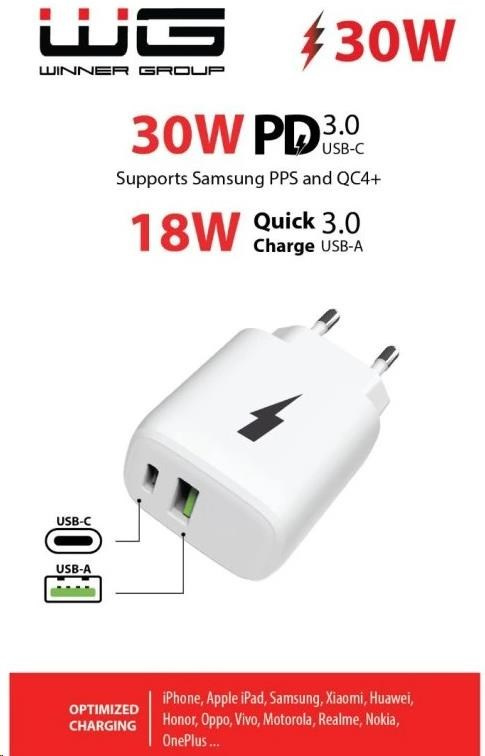 WG - Síťová nabíječka 2x USB, 1x USB-C PD PPS 3.0 30W + 1x USB-A QC4 18W, white
