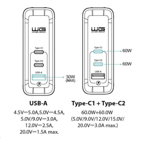 - USB-C1+USB-C2: 5V/9V/12V/15V/20V?3A max. (60W+60W)