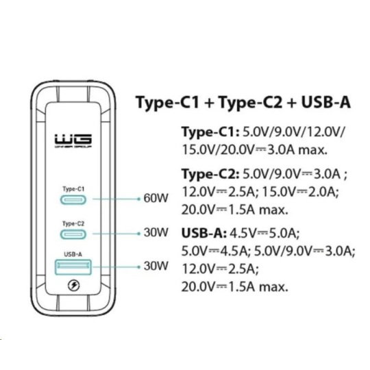 WG - Síťová nabíječka GaN 3x USB 120W, 1x USB-A + 2x USB-C, bílá